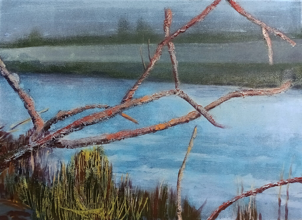 Ich beschäftige mich gerade als Mensch und als Künstlerin mit dem Phänomen von Dichte und Weite, den Zuständen, den Gestaltungsmöglichkeiten und den „Geschichten“ die dieses Gegensatzpaar zu erzählen hat. In einer Landschaft zu sein, in der dieses Beides zu finden ist, ist eine schöne Möglichkeit, darin Erfahrungen zu machen, sowohl für sich selbst als auch in der gestalterischen Umsetzung dieses Themas. Ich möchte in meinem Malkurs darauf Bezug nehmen, möchte anregen, zu wechseln zwischen der Darstellung von Weite und offenen Fernen und dem Verdichten, Konzentrieren eines Naturereignisses in der Nähe. Aquarell, Kreide, Kohle in Verbindung mit Wasser auf dem Bildträger, Bleistift und Buntstift werden unsere Werkzeuge für dieses Vorhaben sein.
