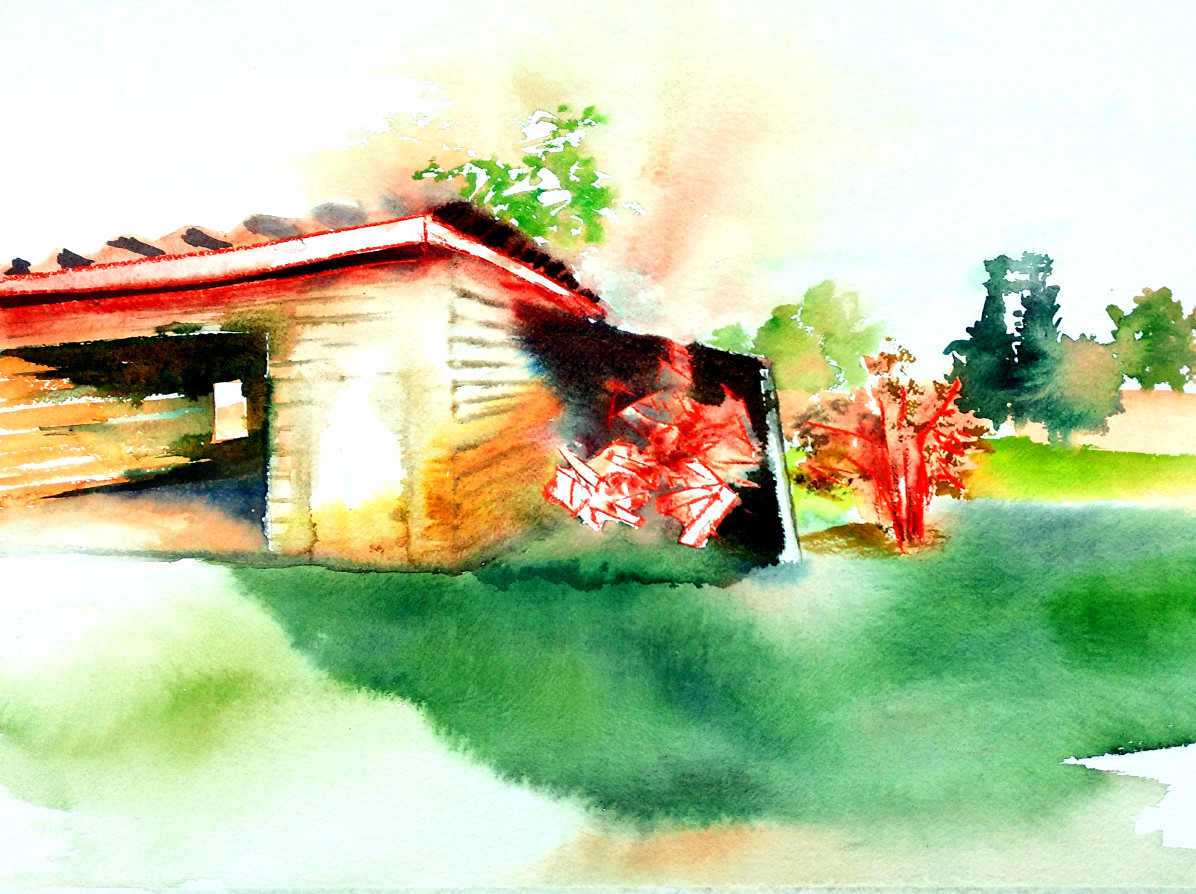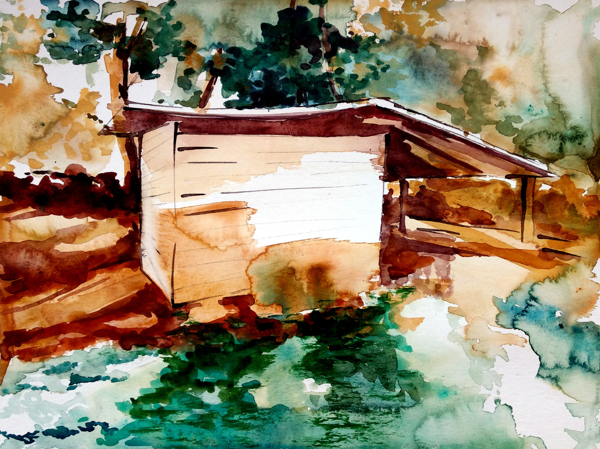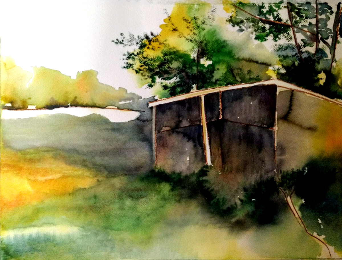 Ich war mir zunächst nicht sicher, ob es eher die Kargheit des Winters ist, die meine Motive hervorbringt oder ob ich auf Ideen des Sommers zurückgreife. Aber dann war mein Bedürfnis eindeutig: ich wollte die Üppigkeit und Freude dieses gewesenen Sommers in mir aufleben lassen. Was mich beim Draußenzeichnen neben dem Wasserthema angezogen hatte, waren die Hütten, denen ich auf meinen kleinen Spaziergängen um mein Dorf begegnet bin. Sie griffen etwas auf von meinem Wunsch, mich in der Natur zu verwurzeln. Sie spiegeln etwas wieder von der Vorstellung, selber so wenig wie möglich einzugreifen in das Geschehen der Landschaft, die mich umgibt. Ich möchte mit meinem Leben Spuren hinterlassen, aber ich möchte sie so wenig wie möglich den Pflanzen und Tieren um mich herum zumuten. Diese Hütten waren ebenso keine „Fremdkörper“ in der Natur. Sie dienten den Bauern und Bewohnern des Dorfes nicht zum Wohnen, sondern zum Unterbringen der landwirtschaftlichen Produkte. Und, aufgrund ihres Materials, kann die Natur sie Stück für Stück zurückerobern wenn sie ihren Zweck erfüllt haben. Natürlich bewege ich mich mit diesen Motiven und meiner Sehnsucht, auf den Spuren der Romantik. Aber ich bewege mich mit ihnen auch auf der Fährte des heutigen Menschen, der mit dem Fortschritt auch um den Halt in den Wurzeln ringt.