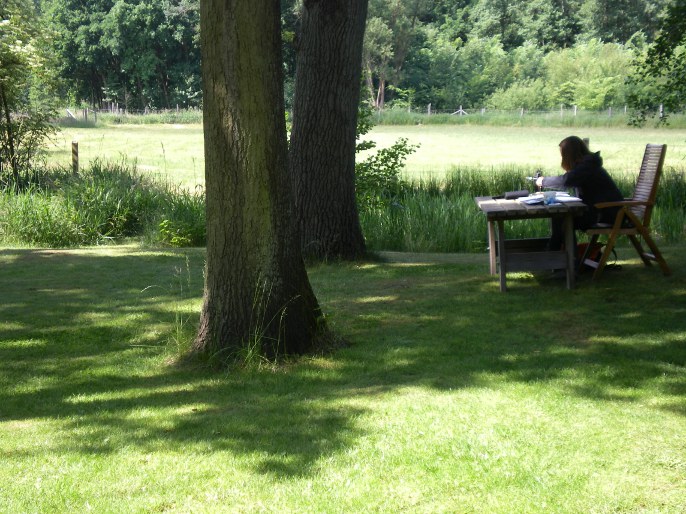 An den beiden folgenden Tagen ( die Appartments haben wir bis Sonntagabend) sind wir mehrheitlich, wenn das Wetter es zuläßt, draußen auf dem Gelände, direkt am Fluss oder auch in der Nähe im Wäldchen, um Inspiration zu finden und anhand der Motive dort das Zeichnen und Malen weiter zu üben.